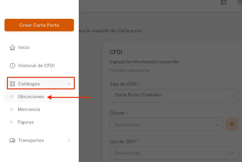 Vista de la creación de la carta porte señalando el menú lateral izquierdo desplegable